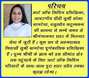 कार्यक्रम रात्रि 8 बजे 'गणेश ओम बोलो गणेश ओम' से गणेश भगवान को वन्दन करते हुए शुरू हुआ। 'जय गुरू ओंकारा',' जय-जय भवानी मां', 'शिव ओम शिवा' तथा 'हे नन्द नन्द गोपाला' आदि भजनों ने माहौल को भक्तिमय बना दिया। कुछ देर के ध्यान के पश्चात आर्ट ऑफ लिविंग की टीम ने 'राधे-राधे श्याम मिला दे', 'भोले की जय-जय' तथा 'मिठे रस से भरी राधा रानी लागे' गाकर श्रद्धालुओं को झूमने पर विवश कर दिया। 'सागर में इक लहर उठी तेरे नाम की' गीत द्वारा जिन श्रद्धालुओं का जन्मदिवस था, उन्हें शुभकानाएं दी गईं। इस अवसर पर बैंगलोर से पधारी प्रशिक्षिका सुश्री शोभा बागरेचा तथा स्थानीय प्रशिक्षिका श्रीमती मीतू शर्मा भी उपस्थित थीं। विनोद गोयल, सुनील अग्रवाल, सुरेन्द्र चौधरी, बबीता चौधरी तथा रीतू अदलखा के साथ गिटार पर पंकज पाहवा तथा ढोलक पर वासुदेव ने संगत की। आगे पढ़ें...